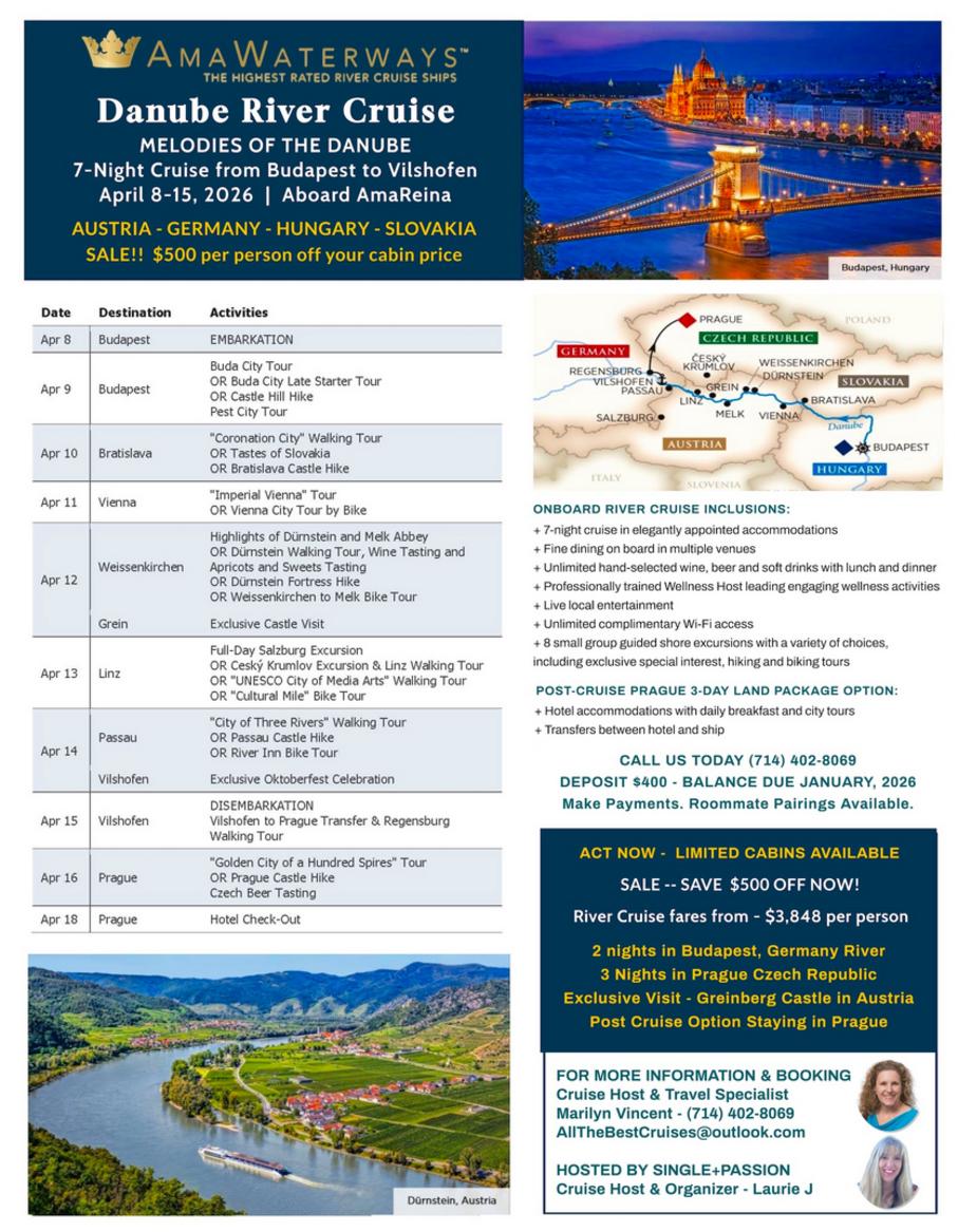 River cruises are amazing. Join us as we head to Europe for a DANUBE RIVER CRUISE April 8-15, 2026. SAVE $500 OFF per person now... starting at $3,848. Enjoy this all-inclusive trip on the AmaReina. Come visit 4 countries with 8 guided historical stops along the Danube and choices to bike, hike or walking tours. Hold your spot with a $400 DEPOSIT. Balance is due January 8, 2026.